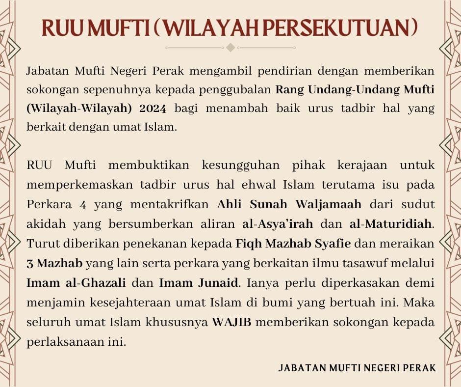IPOH 5 Julai – Jabatan Mufti Negeri Perak (JMNPk) menyokong penuh Rang Undang-Undang (RUU) Mufti (Wilayah Persekutuan) 2024 untuk memberi takrifan kepada Ahli Sunnah Wal Jamaah (ASWJ) yang sudut akidahnya bersumberkan aliran al-Asyairah dan al-Maturidiah. Menurut JMNPK, RUU itu bukti kesungguhan kerajaan memperkemas tadbir urus hal ehwal Islam, terutama pada isu takrifan ASWJ, dan wajib disokong demi menjamin kesejahteraan umat Islam negara ini. JMNPk merujuk Perkara 4 yang mentakrifkan ASWJ dari sudut akidah bersumberkan aliran al-Asya’irahal-Asya’irah dan al-Maturidiah, selain penekanan kepada Fiqh Mazhab Syafie dan meraikan tiga mazhab yang lain.…