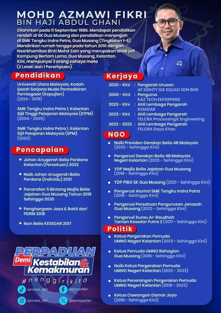 GUA MUSANG 3 Ogos – Calon Barisan Nasional (BN) bagi Pilihan Raya Negeri (PRK) Dewan Undangan Negeri (DUN) Nenggiri, Mohd Azmawi Fikri Abdul Ghani berjanji akan melakukan yang terbaik untuk masyarakat di kawasan itu. Ketua Pemuda UMNO Kelantan itu meminta pengundi di kawasan itu memberi peluang kepadanya untuk menjadi wakil rakyat. “Kepada semua pengundi Nenggiri, jika saya diberi peluang jadi wakil rakyat, saya akan lakukan yang terbaik. “Saya akan bekerja keras untuk memenangi hati pengundi di kawasan ini,” katanya pada sidang media di Pusat Penamaan Calon PRK DUN Nenggiri di…