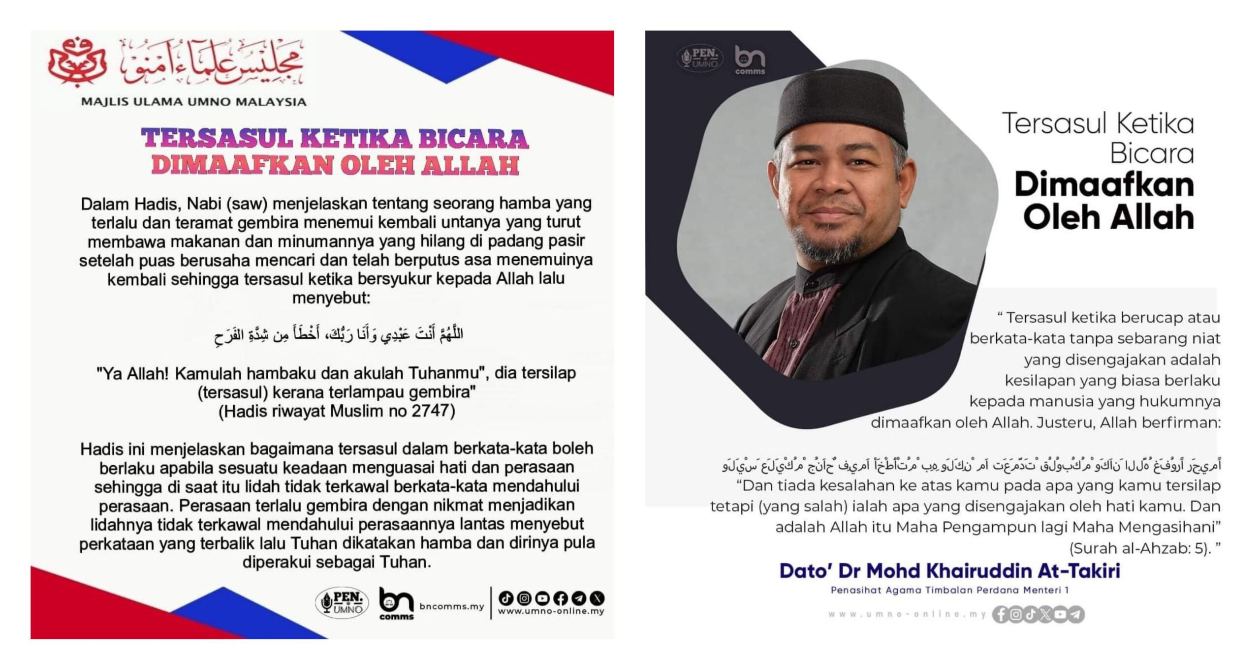 KUALA LUMPUR 6 Ogos – Susulan isu tersasul oleh Dr Ahmad Zahid Hamidi ketika berpidato, Majlis Ulama UMNO Malaysia (MUUM) tampil menjelaskan bahawa tersasul ketika bicara dimaafkan Allah SWT. Turut sama memberi penjelasan adalah Penasihat Agama Timbalan Perdana Menteri 1 Dr Mohd Khairuddin At-Takiri. Melalui hantaran di Facebook UMNO online, MUUM menarik perhatian mengenai hadis Nabi SAW yang menjelaskan tentang seorang hamba yang terlalu dan teramat gembira menemui kembali untanya yang hilang. Setelah puas berusaha dan mencari, akhirnya unta itu ditemukan semula sehingga hamba itu tersasul ketika bersyukur kepada Allah.…