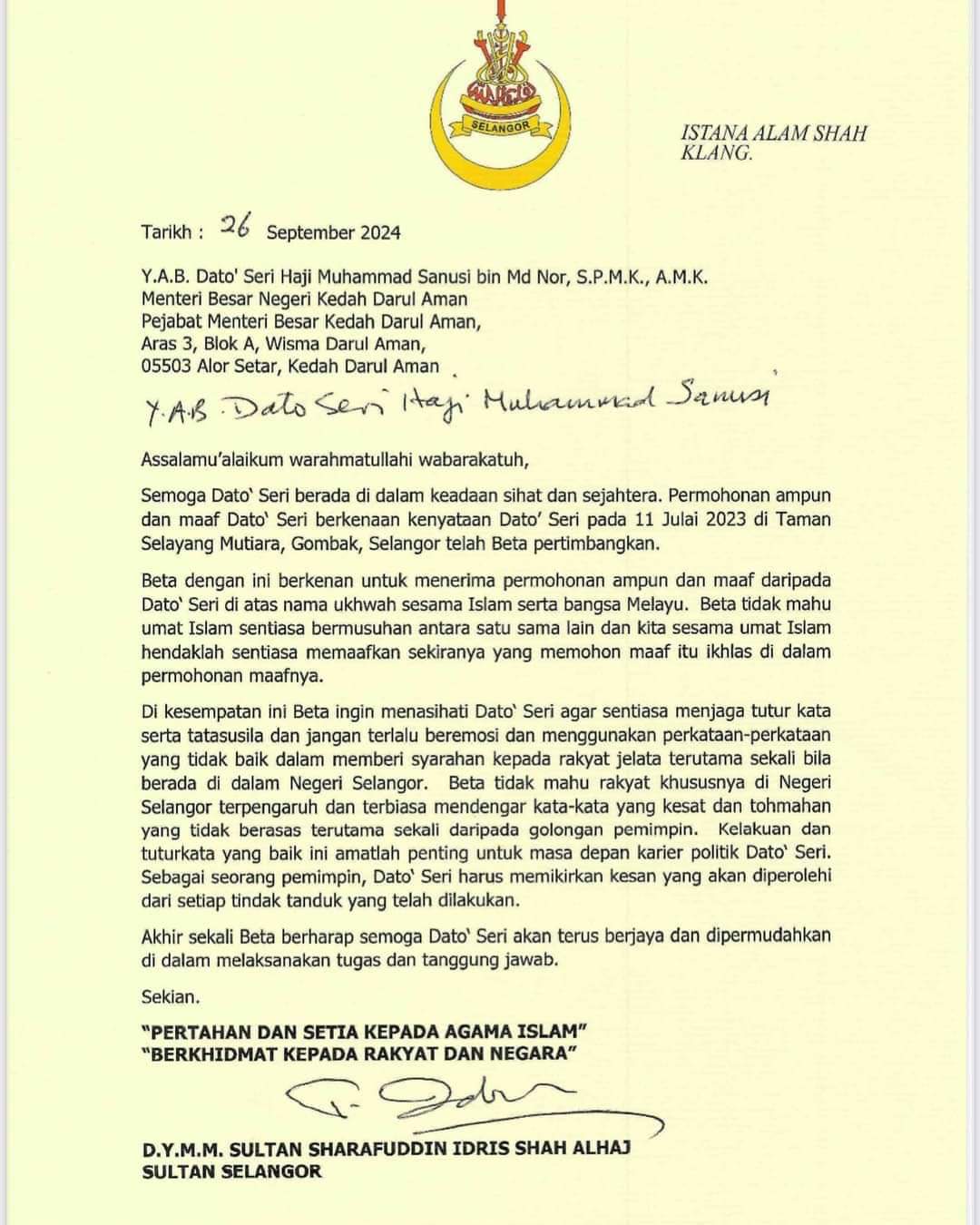 SHAH ALAM 26 Sept. – Sultan Selangor Sultan Sharafuddin Idris Shah berkenan menerima permohonan ampun dan maaf daripada Menteri Besar Kedah, Muhammad Sanusi Md Nor di atas nama ukhwah sesama Islam serta bangsa Melayu. Menerusi surat titah yang dimuatnaik Facebook Selangor Royal Office, baginda tidak mahu umat Islam sentiasa bermusuhan antara satu sama lain. “Kita sesama umat Islam hendaklah sentiasa memaafkan sekiranya yang memohon maaf itu ikhlas di dalam permohonan maafnya,” titah baginda sambil menasihati Sanusi agar sentiasa menjaga tutur kata serta tatasusila. Baginda menasihatkan Sanusi supaya tidak terlalu beremosi…
