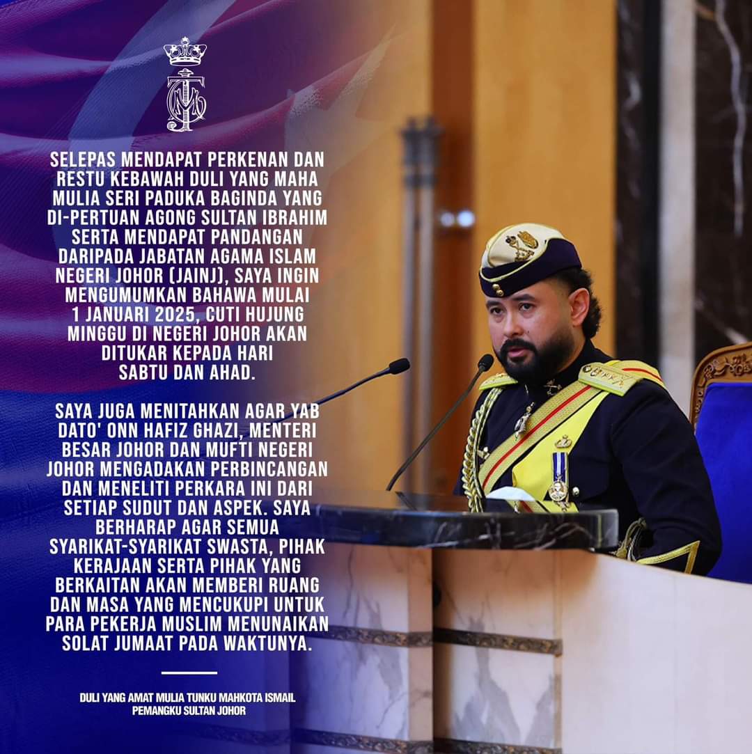 Untuk rekod, Sultan Ibrahim telah mengubah cuti mingguan negeri Johor kepada Jumaat dan Sabtu bermula 1 Januari 2014.