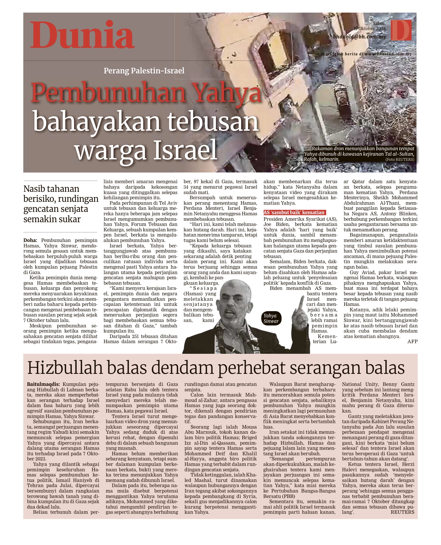 TEL AVIV – Jasad Yahya Sinwar yang dibunuh oleh rejim Zionis pada Rabu lalu kini disimpan di sebuah lokasi rahsia di selatan Gaza yang mungkin digunakan sebagai ‘alat tawar-menawar’ untuk pertukaran bagi membebaskan tebusan Israel. Media melaporkan, keutamaan Israel kemungkinan adalah memastikan pembebasan tebusan dalam menentukan cara memanfaatkan jasad tokoh yang dituduh oleh Israel sebagai dalang serangan pengganas pada 7 Oktober tahun lalu. Pihak berkuasa Israel sedang menimbang cara untuk ‘mewujudkan tekanan secara mendesak’ ke atas Hamas supaya melepaskan lebih 100 tebusan yang masih berada dalam tahanan di Gaza. “Jika…