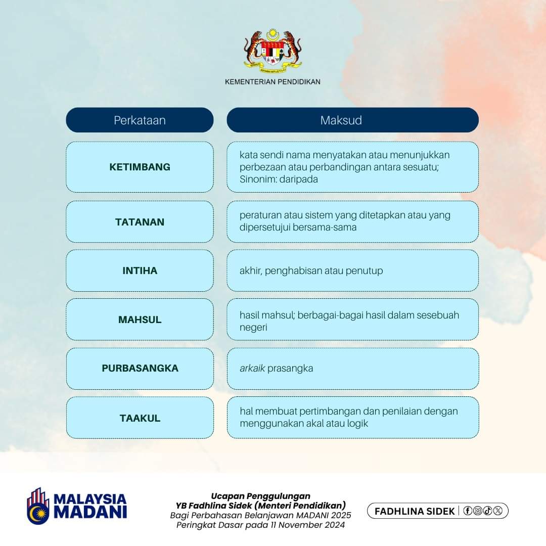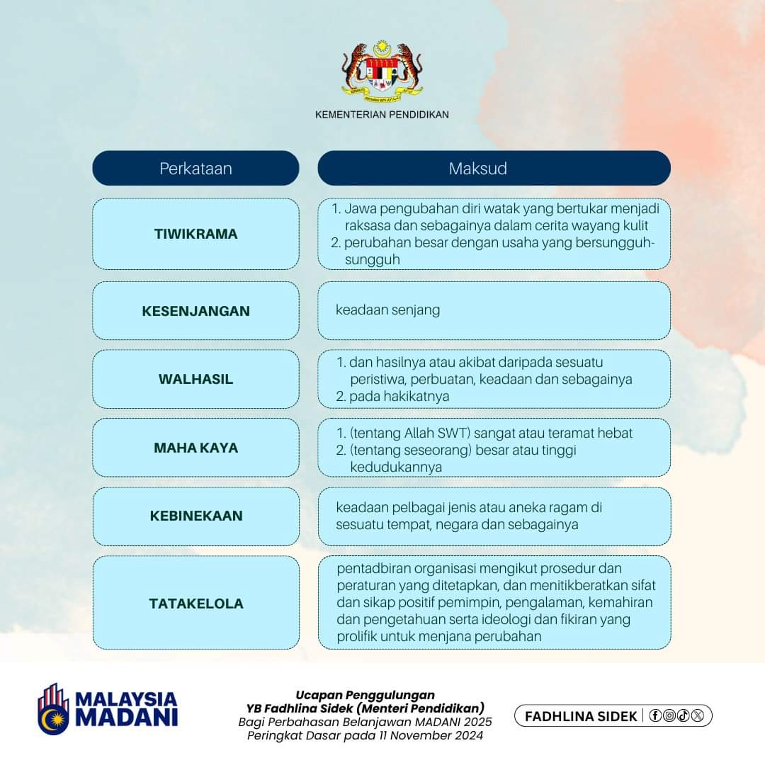 KUALA LUMPUR 12 Nov. – Menteri Pendidikan, Fadhlina Sidek meminta Ahli-ahli Parlimen agar tidak bersikap jumud dalam memperkaya dan memartabatkan bahasa Melayu, memandangkan perbendaharaan kata terus hidup dan sentiasa berkembang.