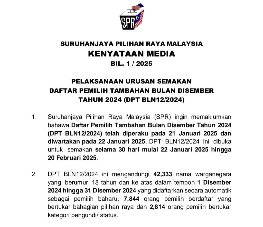 PUTRAJAYA 20 Feb. – Semakan Daftar Pemilih Tambahan Bulan Disember Tahun 2024 (DPT BLN12/2024) akan berakhir pada 22 Februari ini selepas dibuka untuk semakan sejak 22 Januari lalu.