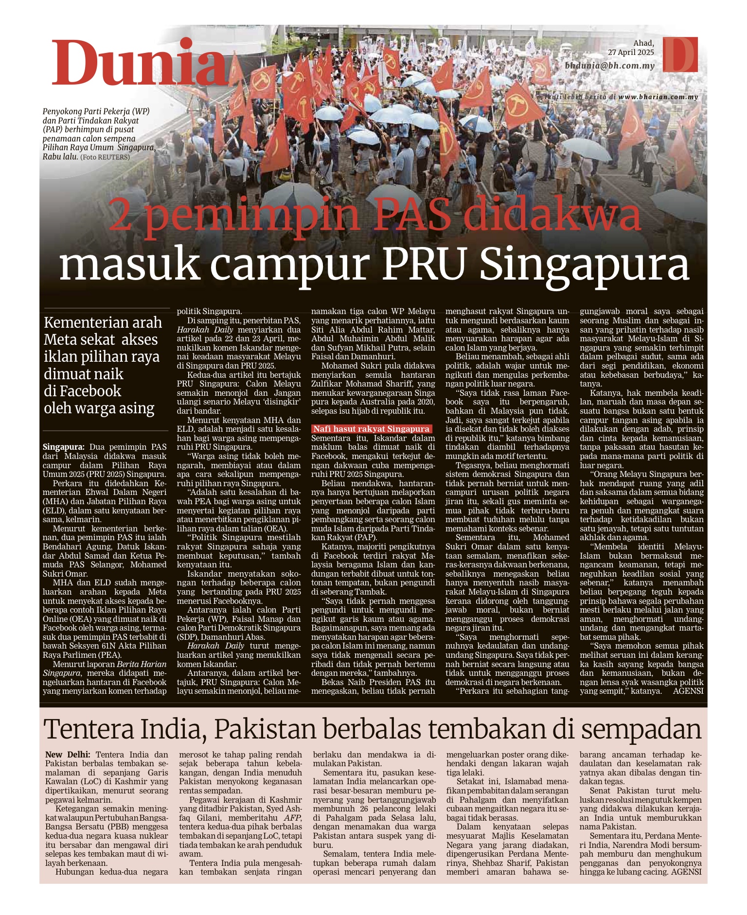 ISLAMABAD – Pakistan bersedia mempertahankan negara itu susulan serangan maut di Kashmir yang ditadbir India, yang menyaksikan 26 pelancong dibunuh pengganas 22 April lalu, di Pahalgam, Kashmir. Perdana Menteri Pakistan, Shehbaz Sharif, jugq menggesa siasatan pemulihan dijalankan, selepas India menuduh negara itu menyokong keganasan rentas sempadan. “Angkatan tentera kita berani, kekal berupaya dan bersedia sepenuhnya untuk mempertahankan kedaulatan negara,” kata Sharif ketika berucap dalam satu majlis ketenteraan di Abbottabad. Serangan berkenaan adalah serangan terburuk ke atas orang awam di wilayah majoriti Islam itu dalam tempoh 25 tahun. Tentera India dalam…