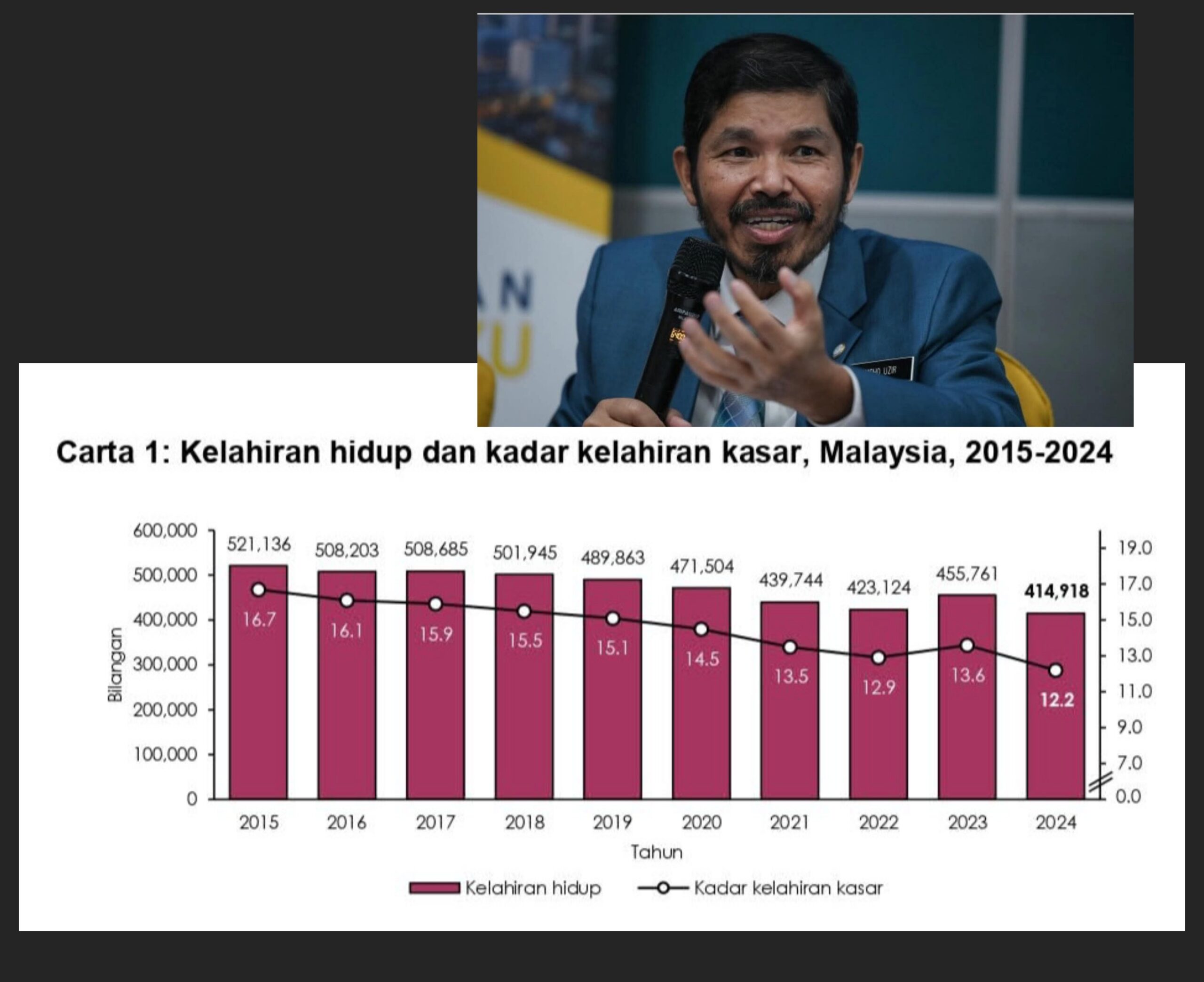 PUTRAJAYA 16 Okt. – Malaysia merekodkan bilangan kelahiran hidup terendah sejak 1980 dengan 414,918 kelahiran pada 2024, berbanding 455,761 kelahiran pada tahun sebelumnya, iaitu menurun sebanyak sembilan peratus. Ketua Perangkawan, Jabatan Perangkaan Malaysia (DOSM) Dr Mohd Uzir Mahidin, dalam kenyataan hari ini berkata kelahiran bayi lelaki direkodkan melebihi bayi perempuan, iaitu masing-masing dengan 213,919 dan 200,999. “Penurunan bilangan kelahiran ini telah mengakibatkan kadar kelahiran kasar (CBR) turut merekodkan penurunan daripada 13.6 kelahiran pada 2023 kepada 12.2 kelahiran bagi setiap 1,000 penduduk pada 2024. “Nisbah jantina ketika lahir (SRB) merekodkan penurunan…