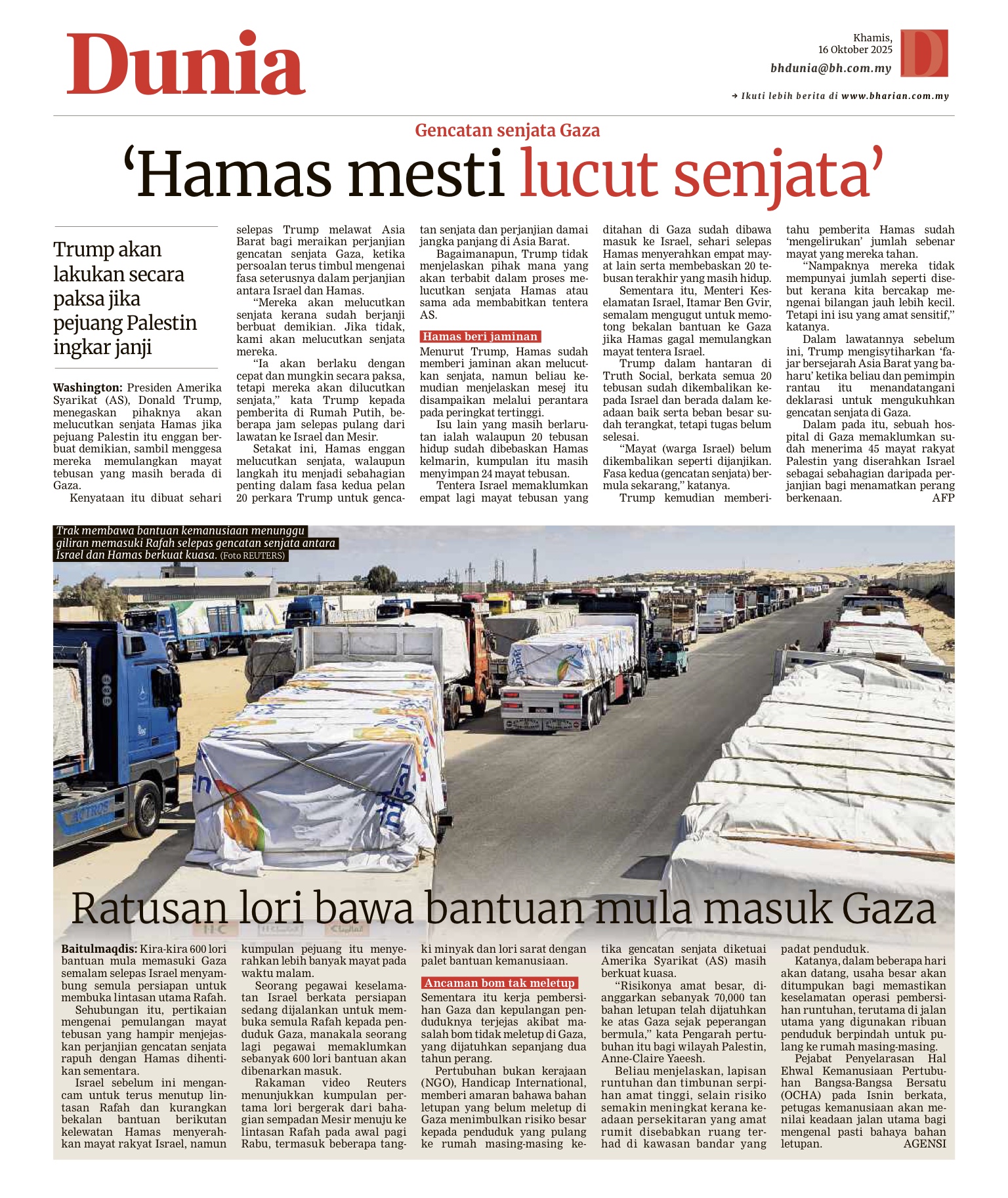 BAITULMUQADDIS – Hamas mengecam tindakan tentera Israel menyerbu Masjid Al-Hijra di Beit Hanina, Baitulmuqaddis Timur ketika orang ramai sedang menunaikan solat, kelmarin. Ahli Biro Politik Hamas, Haroun Nasser al-Din, berkata tentera Israel menghina masjid dengan memakai kasut di dalamnya dan memaksa jemaah menghentikan solat. Beliau yang juga Ketua Pejabat Hal Ehwal Quds, berkata perbuatan tersebut menunjukkan Israel tidak menghormati piawaian agama dan moral serta gagal mematuhi norma kemanusiaan. Dalam kenyataannya kepada Agensi Berita Yaman, Saba, Nasser al-Din berkata serbuan itu berlaku di tengah-tengah “perang agama berterusan oleh penjajah” dan serangan…