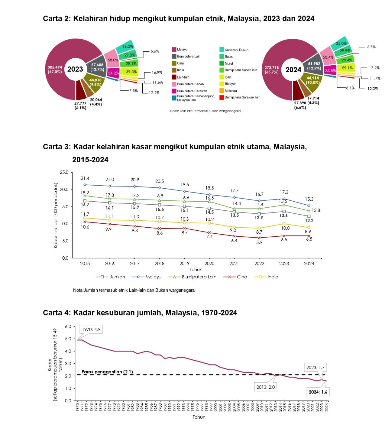 Kelahiran hidup bagi etnik Cina merekodkan peningkatan daripada 9.8 peratus (44,818) kepada 10.8 peratus (44,914), manakala etnik India merekodkan penurunan daripada 4.4 peratus (20,064) kepada 4.3 peratus (17,914) pada 2024.