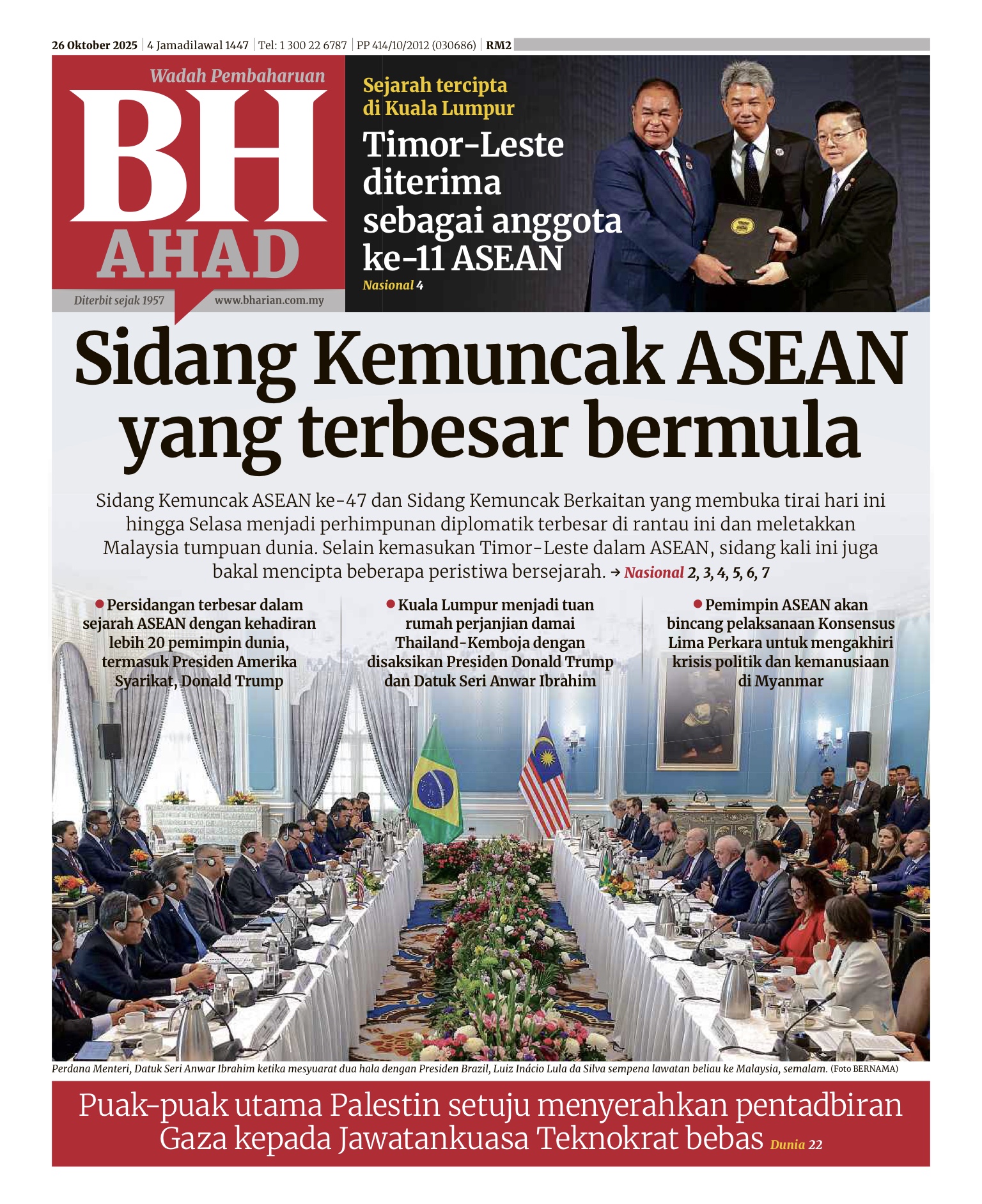 KUALA LUMPUR 26 Okt. – Timor-Leste secara rasminya menjadi negara anggota ASEAN ke-11 selepas 14 tahun negara itu memohon untuk menyertai blok serantau itu pada tahun 2011 setelah merdeka pada tahun 2002. Penyertaan direalisasikan sempena Majlis Menandatangani Deklarasi Penyertaan Timor-Leste ke ASEAN yang ditandatangani semua 11 pemimpin negara anggota yang dipengerusikan Perdana Menteri, Anwar Ibrahim. Detik penuh bermakna menyusul selepas bendera Timor-Leste dipasang di atas pentas sebaris dengan 10 negara anggota lain, menandakan simbolik penyertaan. Perdana Menteri Timor-Leste, Kay Rala Xanana Gusmão, dalam ucapan pertama selepas secara rasmi menjadi Negara…