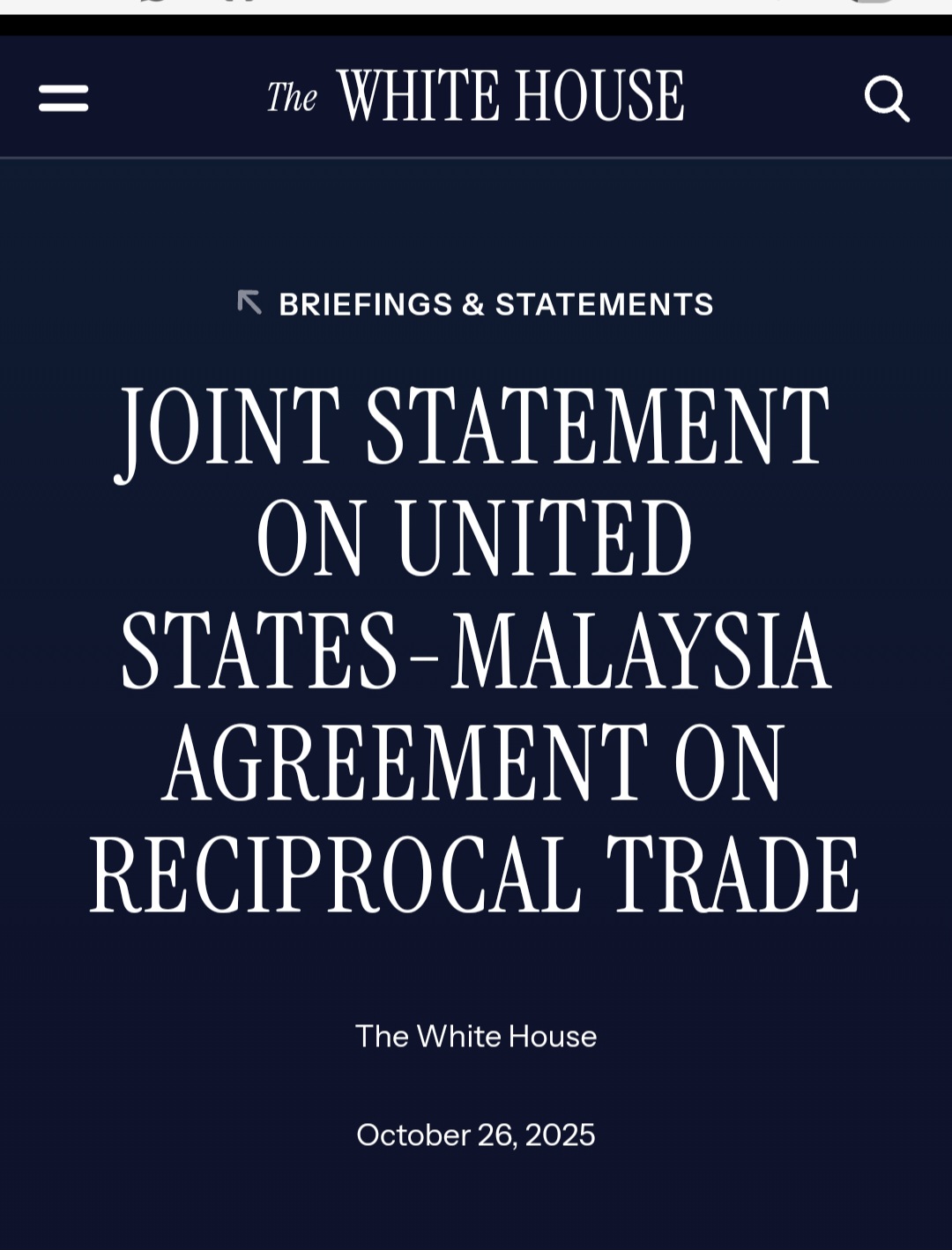 Briefings & Statements JOINT STATEMENT ON UNITED STATES-MALAYSIA AGREEMENT ON RECIPROCAL TRADE The White House October 26, 2025 The Government of the United States of America (“the United States”) and the Government of Malaysia have reached agreement on an Agreement on Reciprocal Trade (“the Agreement”) to strengthen our bilateral economic relationship, which will provide both countries’ exporters unprecedented access to each other’s markets. The Agreement will build upon our longstanding economic relationship, including the United States-Malaysia Trade Investment Framework Agreement signed in 2004. Key terms of the Agreement on Reciprocal Trade between the…
