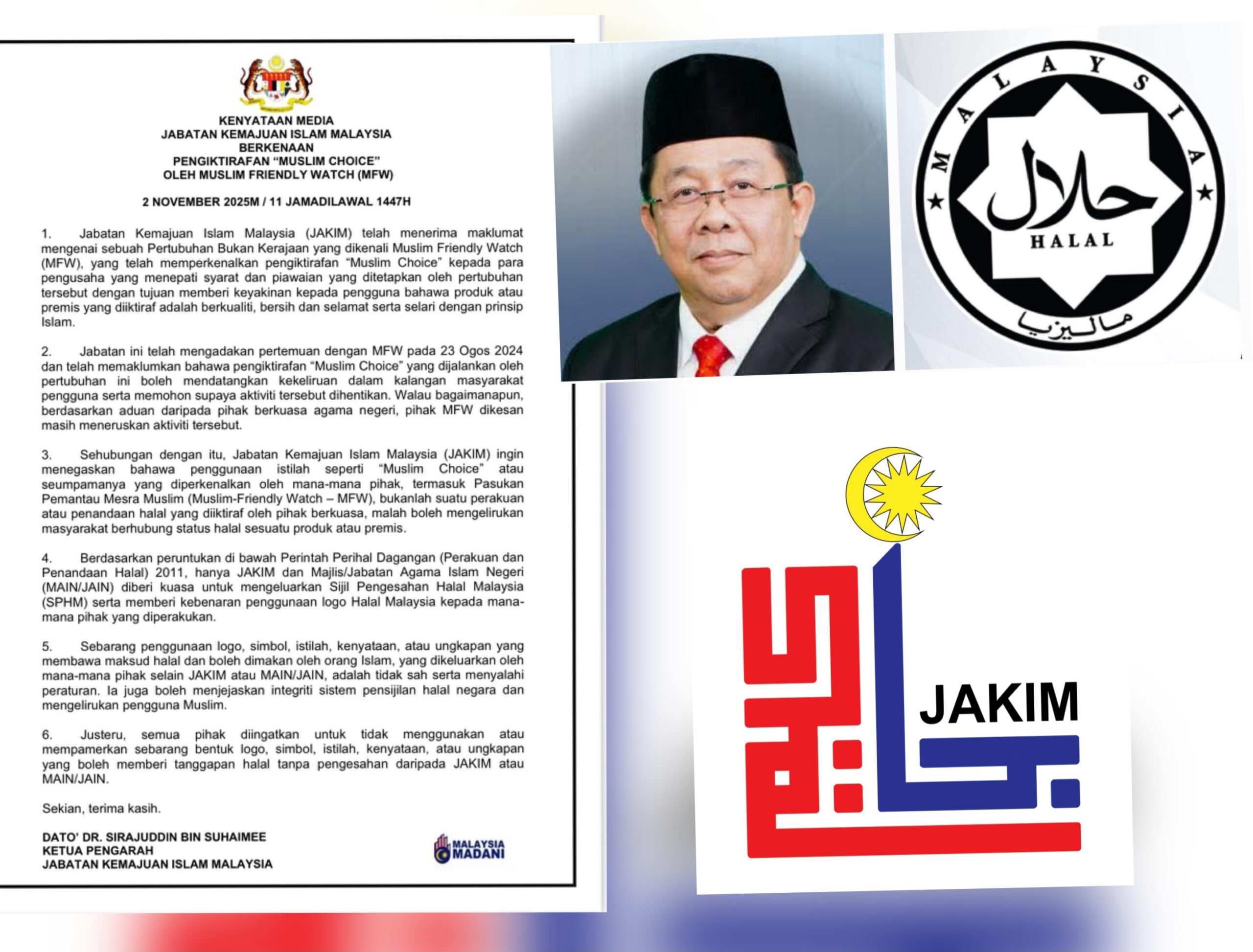 Sirajuddin berkata, Jakim pernah bertemu MFW pada 23 Ogos 2024 dan memaklumkan bahawa pengiktirafan ‘Muslim Choice’ boleh mendatangkan kekeliruan dalam kalangan pengguna.