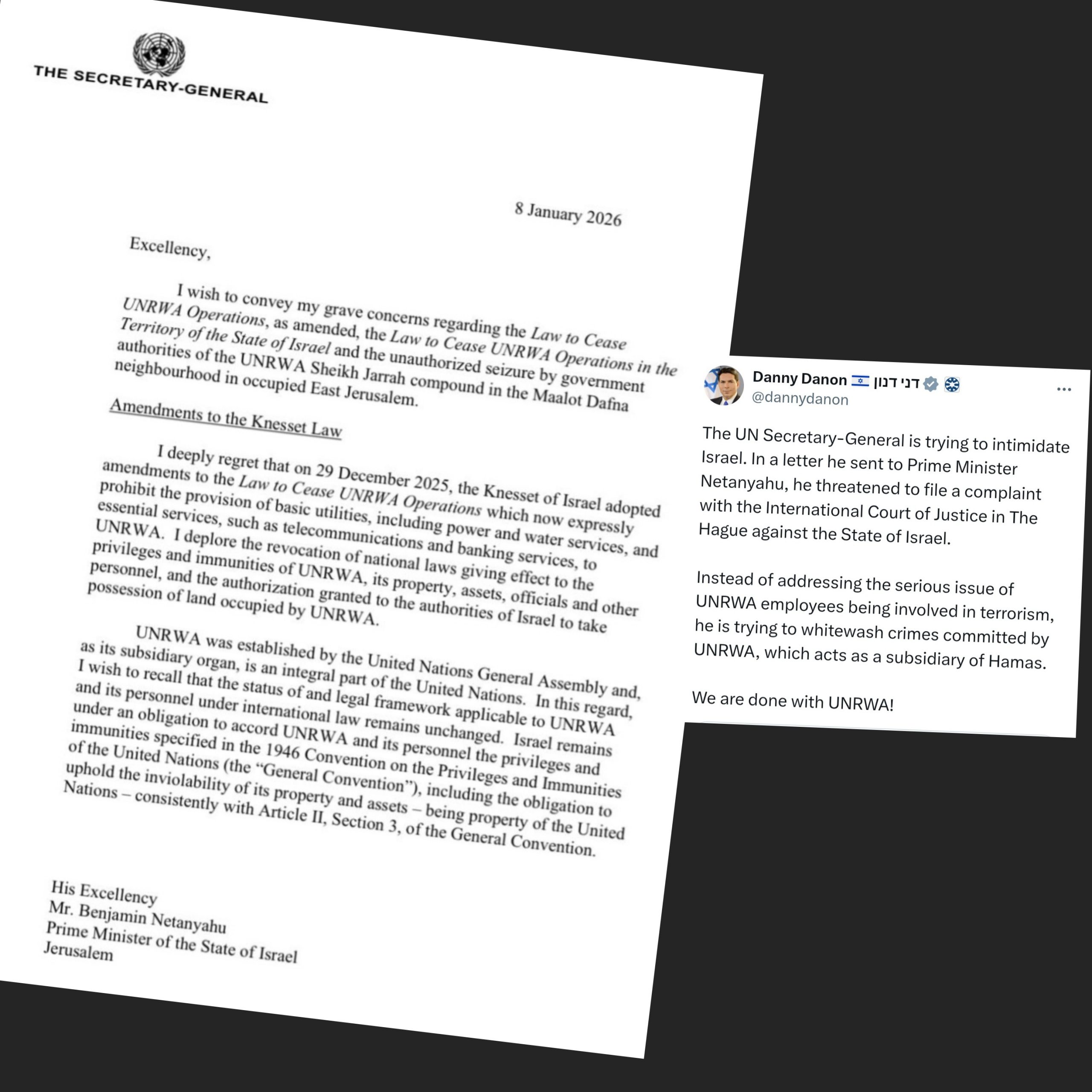 NEW YORK – Israel boleh dirujuk ke Mahkamah Keadilan Antarabangsa (ICJ) sekiranya gagal memansuhkan undang-undang yang menyasarkan agensi pelarian Palestin Pertubuhan Bangsa-Bangsa Bersatu (PBB), UNRWA, serta memulangkan semula aset dan hartanah yang dirampas. Setiausaha Agung PBB, António Guterres, memberi amaran itu menerusi sepucuk surat kepada Perdana Menteri Israel, Benjamin Netanyahu. Dalam surat bertarikh 8 Januari itu, Guterres menegaskan PBB tidak boleh berdiam diri terhadap “tindakan yang diambil oleh Israel yang jelas bercanggah dengan kewajipannya di bawah undang-undang antarabangsa dan mesti dibatalkan tanpa sebarang kelewatan”,. Parlimen Israel meluluskan undang-undang pada Oktober…