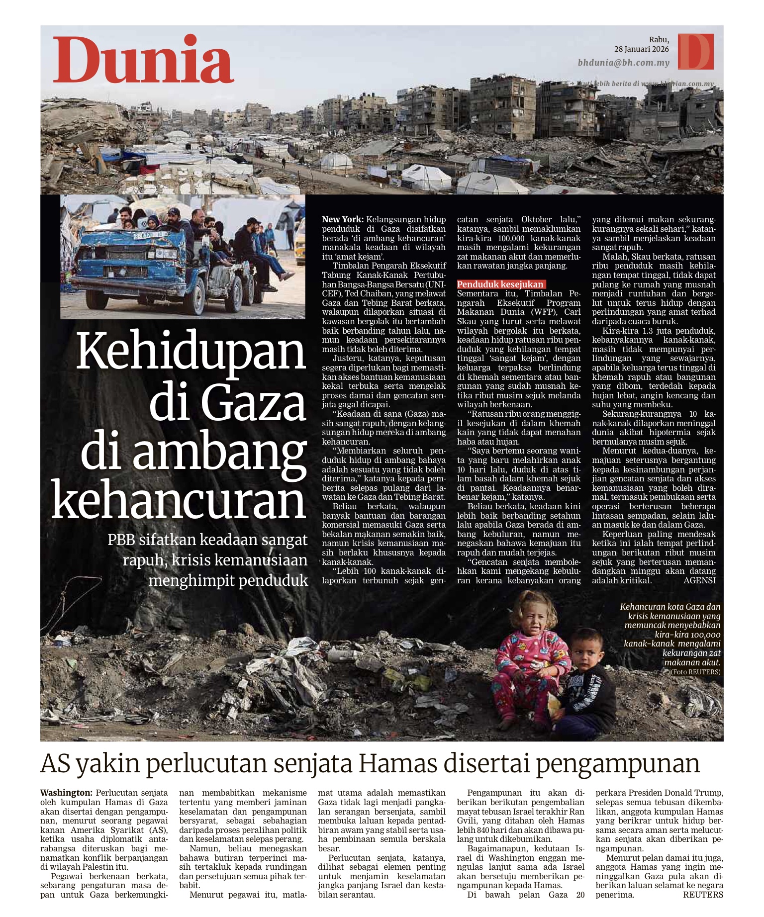 GENEVA – Tabung Kanak-Kanak Pertubuhan Bangsa-Bangsa Bersatu (UNICEF), memerlukan dana sebanyak AS$86 juta, untuk melaksanakan program pendidikan di Gaza tahun ini, kata jurucakapnya, James Elder. Jumlah itu “lebih kurang sama dengan apa yang dibelanjakan dunia untuk kopi dalam tempoh satu atau dua jam”. Sejak bermulanya perang susulan serangan Hamas ke atas Israel pada Oktober 2023, hampir 90 peratus sekolah di Gaza mengalami kerosakan atau musnah sepenuhnya, manakala lebih 700,000 kanak-kanak tercicir daripada akses pendidikan formal. “Hampir dua setengah tahun serangan terhadap sistem pendidikan di Gaza telah meletakkan keseluruhan satu generasi…