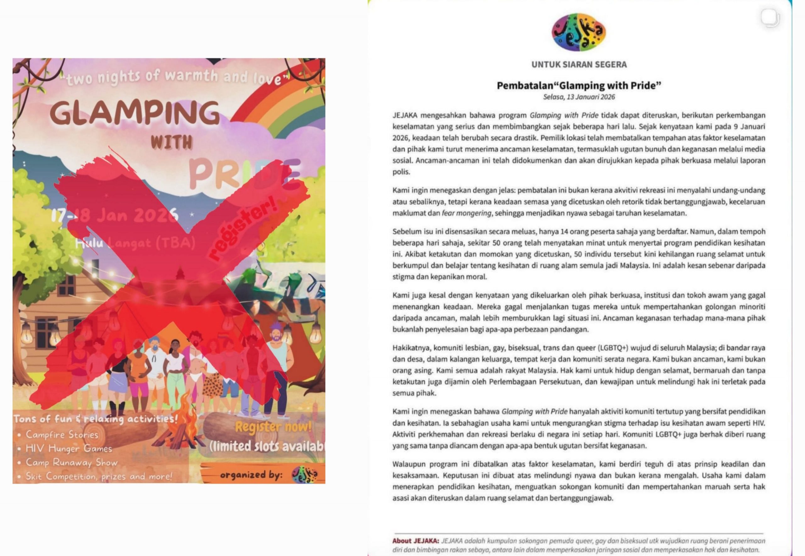 KUALA LUMPUR 13 Jan. – Atas faktor keselamatan, penganjur program perkhemahan “Glamping with Pride” yang sebelum ini didakwa berunsur pergaulan songsang, mengambil keputusan tidak meneruskan program mereka. Dalam satu kenyataan, JEJAKA, penganjur program berkenaan yang dijadualkan di Hulu Langat, hujung minggu ini, berkata pemilik lokasi program juga telah membatalkan tempahan atas faktor keselamatan. Penganjur juga mendakwa turut menerima ugutan bunuh serta ancaman keganasan melalui media sosial dan semua ancaman sudah didokumenkan dan akan dirujuk kepada pihak berkuasa melalui laporan polis. JEJAKA menegaskan dengan jelas bahawa pembatalan ini bukan kerana aktiviti…