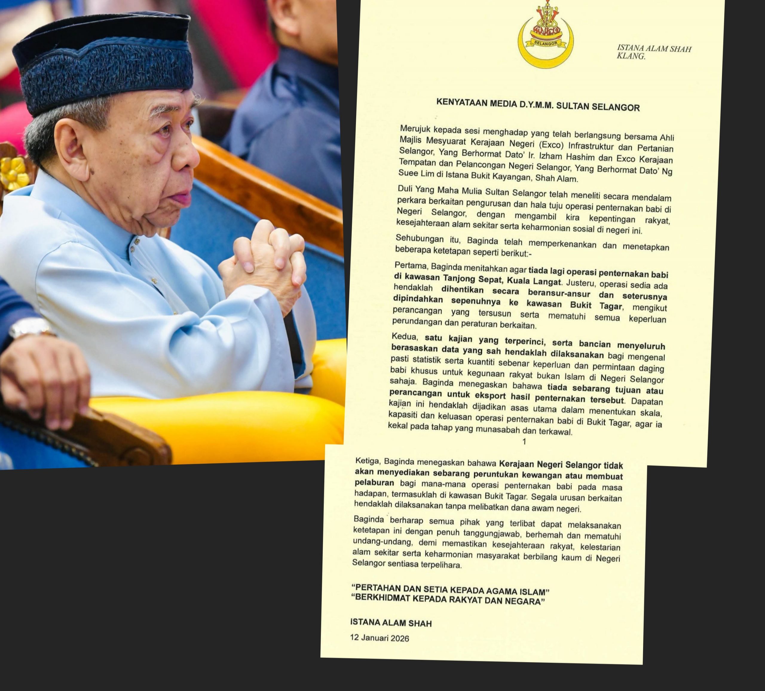 SHAH ALAM 12 Jan. – Sultan Selangor, Sultan Sharafuddin Idris Shah memperkenan tiga ketetapan berkaitan operasi penternakan babi di Selangor termasuk ternakan bukan untuk eksport, hanya untuk memenuhi keperluan di negeri ini sahaja. Baginda juga menitahkan tiada lagi operasi penternakan babi di Tanjong Sepat, Kuala Langat dan kerajaan negeri tidak akan menyediakan peruntukan atau pelaburan bagi mana-mana operasi penternakan babi pada masa hadapan. Tiga ketetapan itu dititahkan baginda ketika sesi menghadap Pengerusi Jawatankuasa Infrastruktur dan Pertanian negeri, Izham Hashim dan Pengerusi Jawatankuasa Kerajaan Tempatan dan Pelancongan Selangor, Ng Suee Lim…