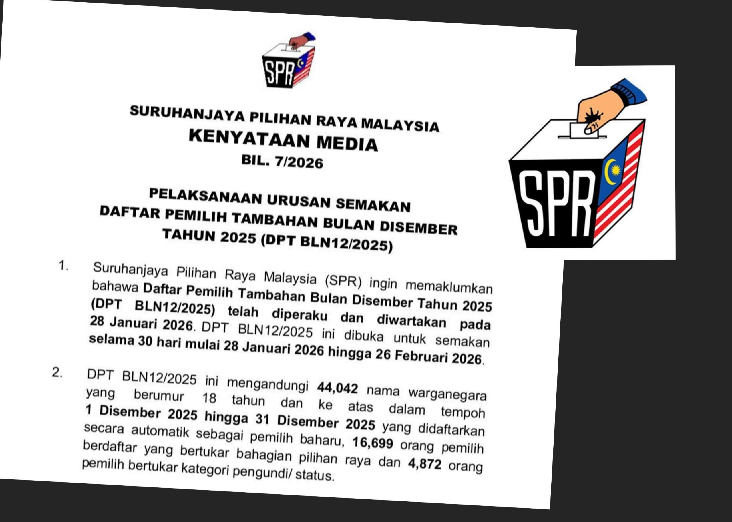 PUTRAJAYA 29 Jan. – Suruhanjaya Pilihan Raya (SPR), merekodkan 44,042 nama warganegara berumur 18 tahun dan ke atas yang didaftarkan secara automatik sebagai pemilih baharu dalam tempoh 1 hingga 31 Disember 2025. Angka itu menunjukkan peningkatan berbanding 40,482 nama yang didaftarkan dalam tempoh 1 hingga 30 November lalu. Rekod sebelum ini menunjukkan 40,911 didaftarkan sepanjang Oktober, 42,305 (September); 55,047 (Ogos); 42,464 (Julai); 40,510 (Jun); 35,583 (Mei); 32,566 (April); 39,241 (Mac); 34,889 (Februari) dan Januari 2025 sebanyak 37,683 orang. Sementara itu, semakan Daftar Pemilih Tambahan Bulan Disember Tahun 2025 (DPT BLN12/2025)…