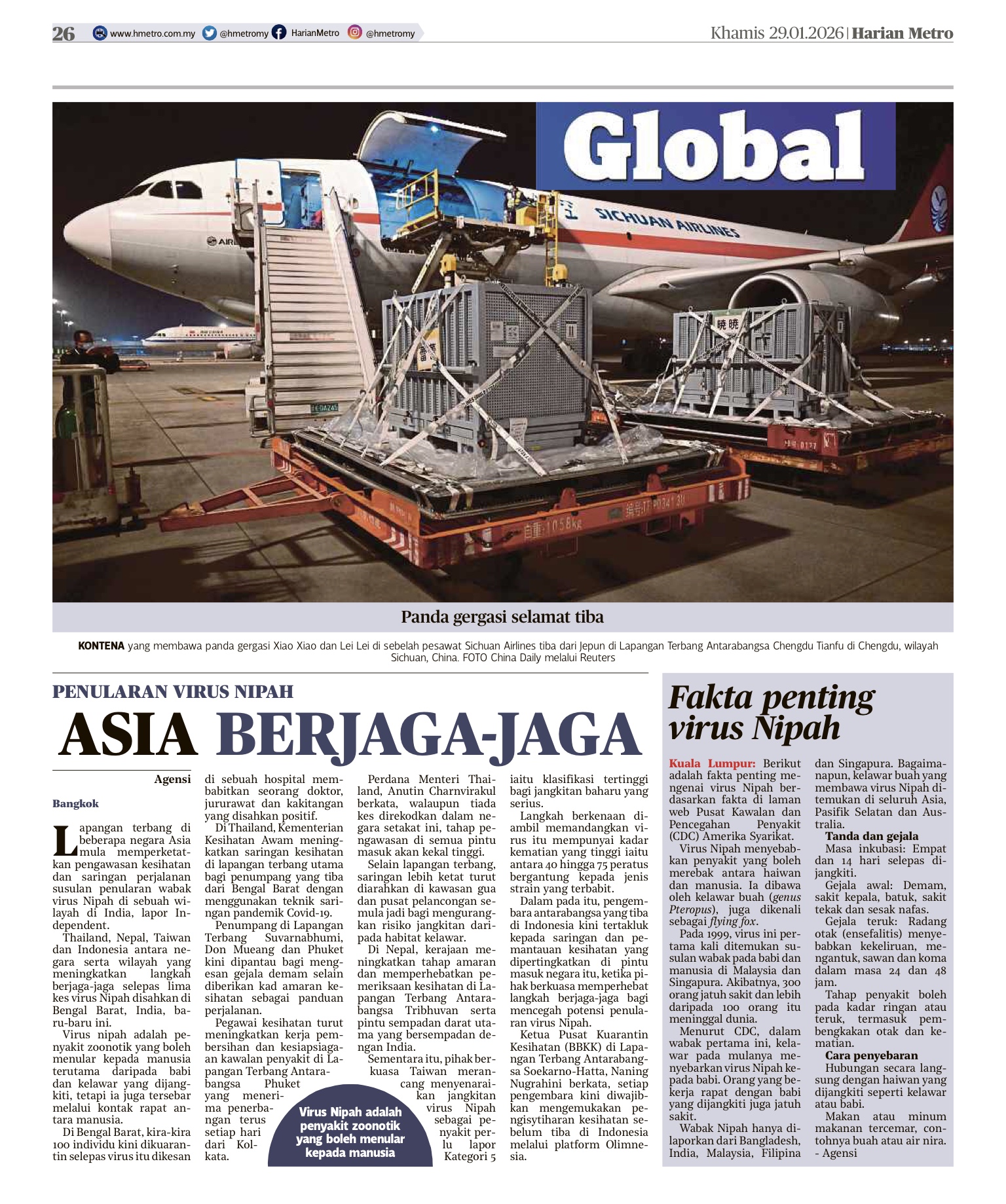 NEW DELHI 29 Jan. – Suruhanjaya Tinggi Malaysia di New Delhi menggesa rakyat Malaysia yang melancong ke India dan mereka yang menetap di negara itu mengambil langkah berjaga-jaga terhadap jangkitan virus Dalam satu kenyataan, Suruhanjaya itu menasihatkan mereka yang melawat kawasan yang mempunyai laporan kes virus Nipah supaya memakai pelitup muka di tempat awam bagi mengurangkan pendedahan kepada titisan cecair. Mereka juga dinasihatkan mengelakkan kawasan sesak jika boleh, mengekalkan kebersihan diri yang ketat, termasuk kerap mencuci tangan, dan mengelakkan makan buah-buahan yang tidak dibasuh atau makanan yang mungkin terdedah kepada…