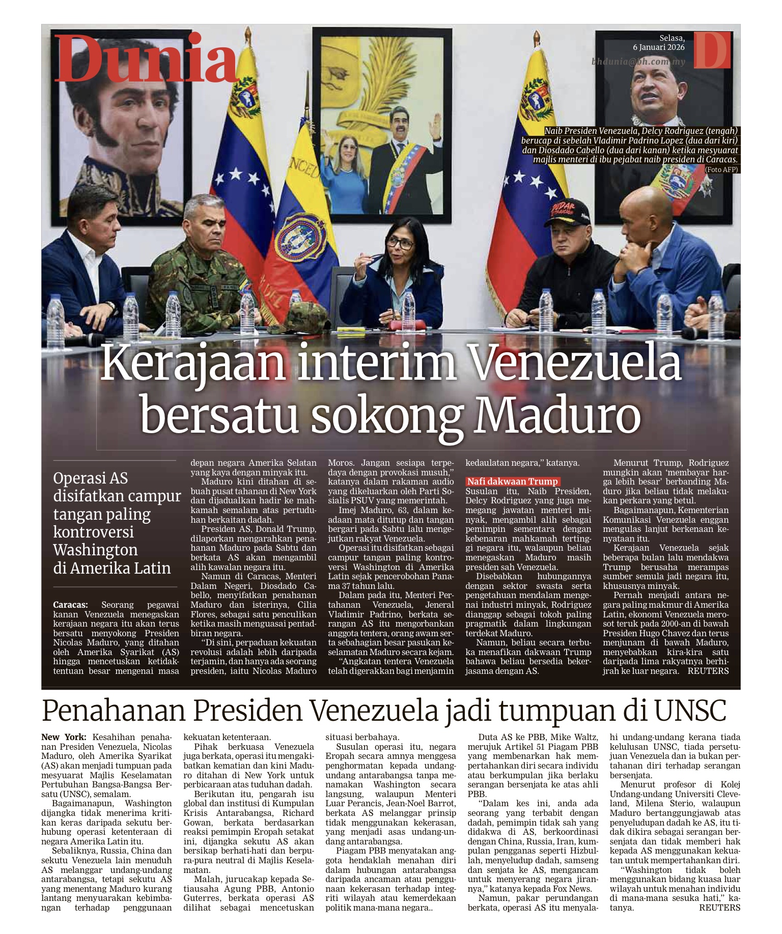 NEW YORK – Nicolas Maduro yang tampil di Mahkamah Persekutuan Manhattan, dengan tegas mengisytiharkan dirinya sebagai “Presiden negara saya” sambil membantah penahanannya. Presiden Venezuela yang digulingkan selepas ditahan dalam operasi ketenteraan Amerika Syarikat (AS) itu mengaku tidak bersalah terhadap pertuduhan pengedaran dadah yang dikenakan ke atasnya. Ketika diminta menyatakan pengakuan, beliau yang mendakwa diculik menegaskan: “Saya tidak bersalah. Saya seorang yang baik, Presiden negara saya.” Isterinya, Cilia Flores, yang turut ditahan bersama beliau hujung minggu lalu, juga mengaku tidak bersalah terhadap pertuduhan pengedaran dadah dan senjata. Beberapa laporan media tempatan…