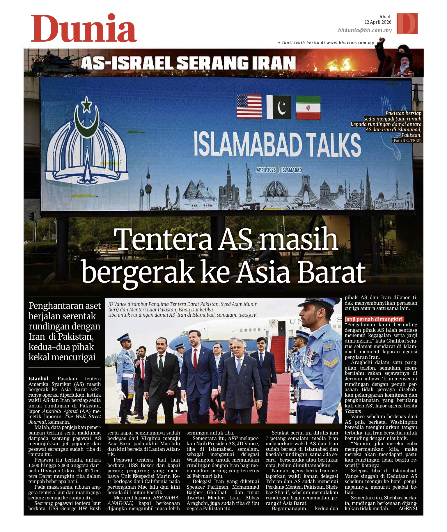 ISLAMABAD – Amerika Syarikat (AS) dan Iran masih berdepan beberapa perbezaan utama dalam rundingan bagi menamatkan konflik ketenteraan selama enam minggu di sini. Dalam hantaran di platform X, kerajaan Iran memaklumkan selepas 14 jam, rundingan telah berakhir dan pakar teknikal dari kedua-dua pihak akan bertukar dokumen. “Rundingan akan diteruskan walaupun masih terdapat beberapa perbezaan,” menurut hantaran itu, tanpa menyatakan bila ia akan disambung semula. Seorang wartawan televisyen negara Iran berkata rundingan akan diteruskan pada Ahad. Perbincangan yang diadakan di Islamabad itu merupakan rundingan langsung pertama antara AS dan Iran dalam…