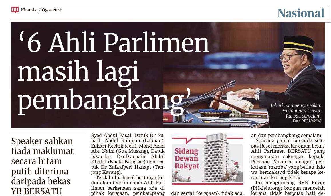 KUALA LUMPUR 7 Ogos – Perikatan Nasional (PN) sudah pun menghantar surat kepada Speaker Dewan Rakyat, Johari Abdul, sebaik saja enam ahli Parlimen Bersatu menyatakan sokongan kepada Perdana Menteri. Ketua Pembangkang, Hamzah Zainudin berkata, beliau hairan dengan kenyataan Johari semalam yang mengesahkan tidak menerima maklumat secara hitam putih berhubung kedudukan enam ahli Parlimen berkenaan. Katanya, mengikut Perlembagaan Persekutuan, sudah jelas menyatakan mana-mana setiausaha agung parti hendaklah memaklumkan perkara itu kepada Speaker. “Mengikut Akta Anti Lompat Parti, setiausaha agung mana-mana parti hantar surat kepada Speaker memaklum, melaporkan perkara itu. Ia terkandung…