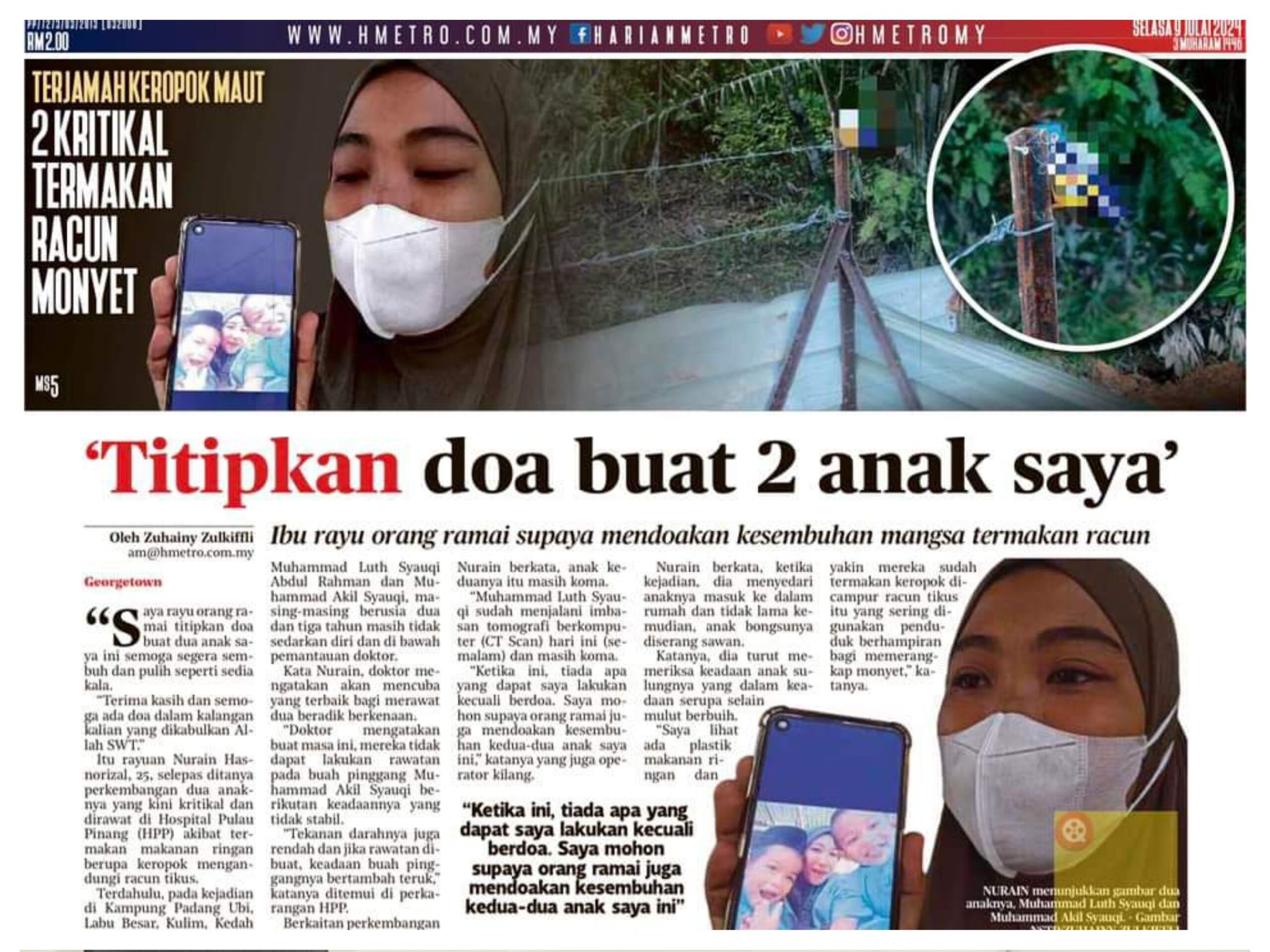 KULIM 10 Julai – Anak sulung kepada dua beradik yang menjadi mangsa keropok beracun meninggal dunia ketika masih dalam rawatan di Hospital Pulau Pinang (HPP) pagi ini. Ketua Polis Daerah Kulim, Superintendan Mohd Azizul Mohd Khairi, berkata Muhammad Akil Syauqi, 3 meninggal dunia pukul 8.30 pagi ini Beliau berkata, adik mangsa yang turut terbabit dalam kejadian itu, Muhammad Luth Syauqi, 2, masih dirawat di hospital sama. Dalam kejadian Ahad lalu, dua beradik lelaki itu kritikal selepas memakan makanan ringan berupa keropok dipercayai mengandungi racun tikus yang dipasang penduduk Kampung Padang…