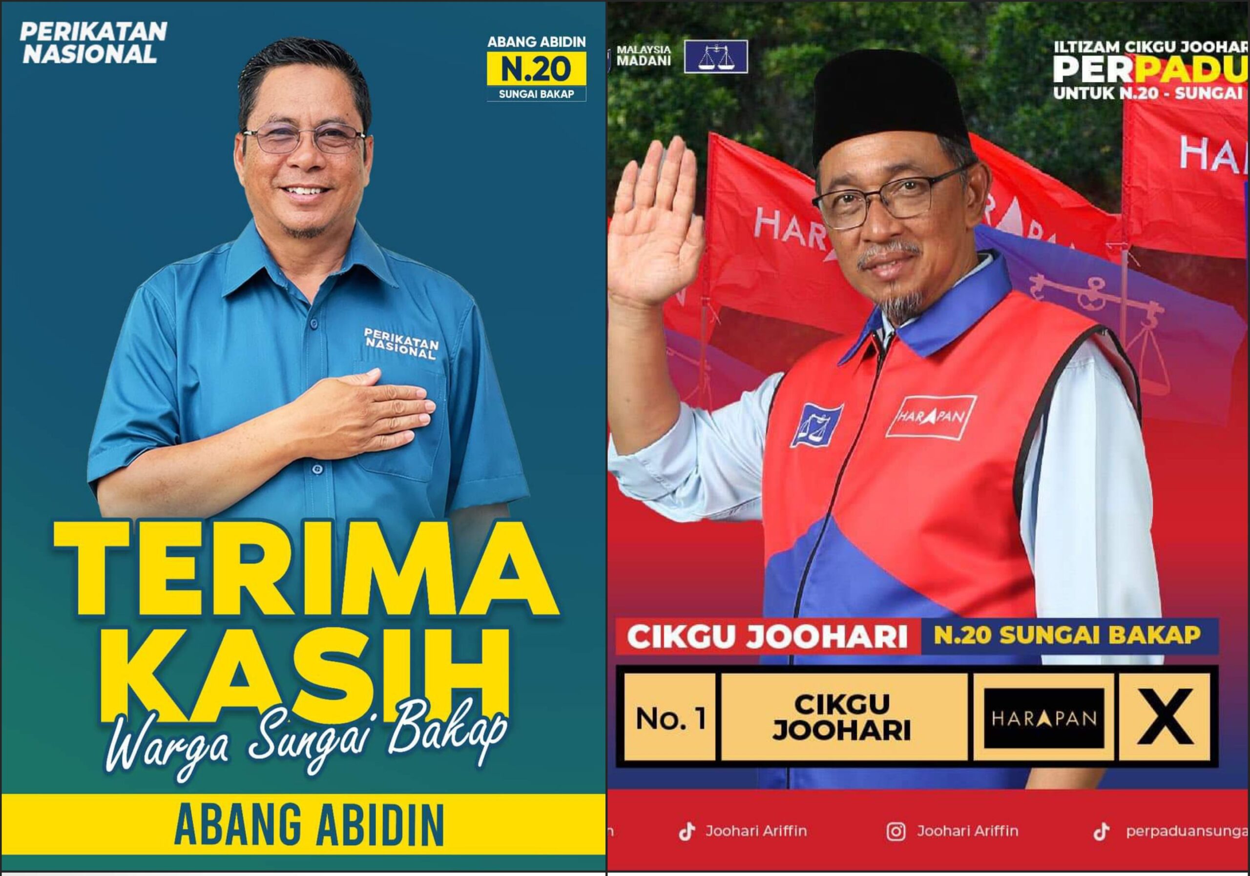 NIBONG TEBAL 6 Julai – Perikatan Nasional (PN) berjaya mengekalkan penguasaan di Dewan Undangan Negeri ( DUN) Sungai Bakap apabila calon mereka Abidin Ismail menang kerusi berkenaan dalam Pilihan Raya Kecil (PRK) hari ini. Pegawai Pengurus Pilihan Raya, Khairulnizam Hashim mengumumkan kemenangan Abidin di Pusat Penjumlahan Rasmi Undi, Dewan Serbaguna Jawi, malam ini. Abidin, 56, yang juga Naib Yang Dipertua Pas Nibong Tebal memperoleh 14,489 undi menewaskan pencabarnya daripada Pakatan Harapan (PH) yang mewakili PKR Dr Joohari Ariffin yang meraih 10,222 undi. Abang Bidin menang dengan majoriti 4,267 undi, jumlah…
